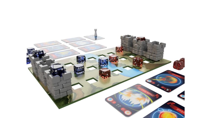 Una particolarità molto interessante del gioco è che è estremamente portatile. La scatola infatti è molto piccola e racchiude totalmente le dimensioni della plancia, permettendo di giocarci in qualunque posto vi troviate; vi basterà aprirla, disporre le torri ed i dadi, e dare il via allo scontro. All’interno troverete anche 12 carte giocabili, 2 delle quali saranno esclusive della versione Kickstarter, per formare i mazzi dei giocatori, ed eventualmente altre 4 qualora venissero raggiunti i rispettivi stretch goal.