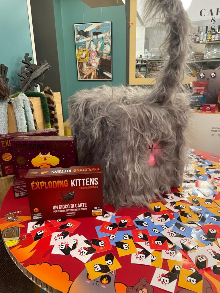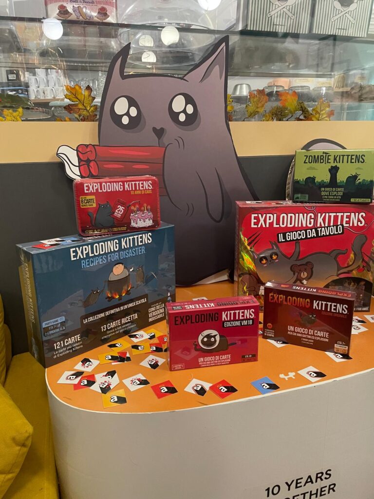 Nato dalle menti di Matthew Inman, Shane Small e Elan Lee, e finanziato in tempi record come progetto di crowdfunding nel 2015, Exploding Kittens é sicuramente tra i party game più popolari e apprezzati nel suo genere. Per festeggiare il decimo anniversario del gioco, lo scorso 25 marzo Asmodee ci ha invitati a una serata decisamente “esplosiva”! E quale miglior cornice del Crazy Cat Café di Milano per brindare a 10 anni di caos?