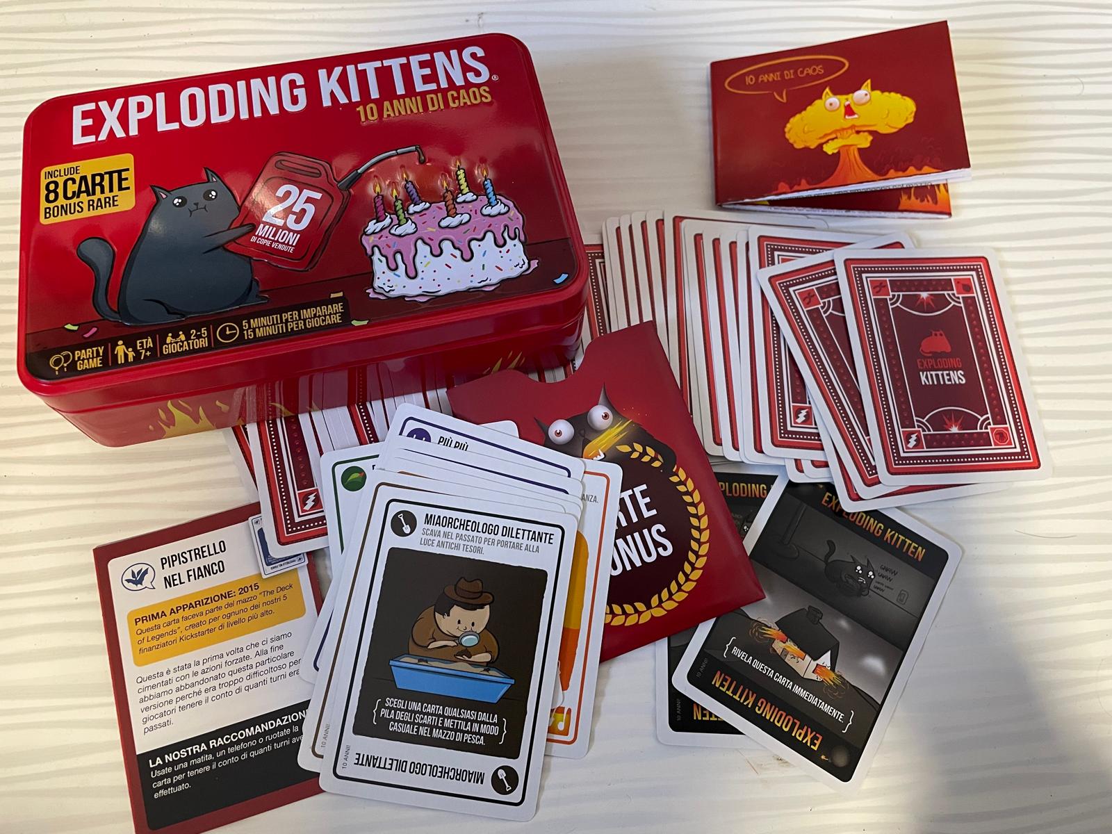 A chiudere i festeggiamenti, Asmodee ci ha anche omaggiato della nuova edizione del gioco Exploding Kittens 10 anni di caos, che include 8 carte bonus risalenti alle prime pubblicazioni e poi eliminate per ribilanciare il gioco… quindi perché non reintrodurle e portare ancora più scompiglio nelle partite?