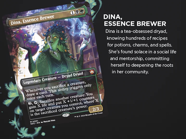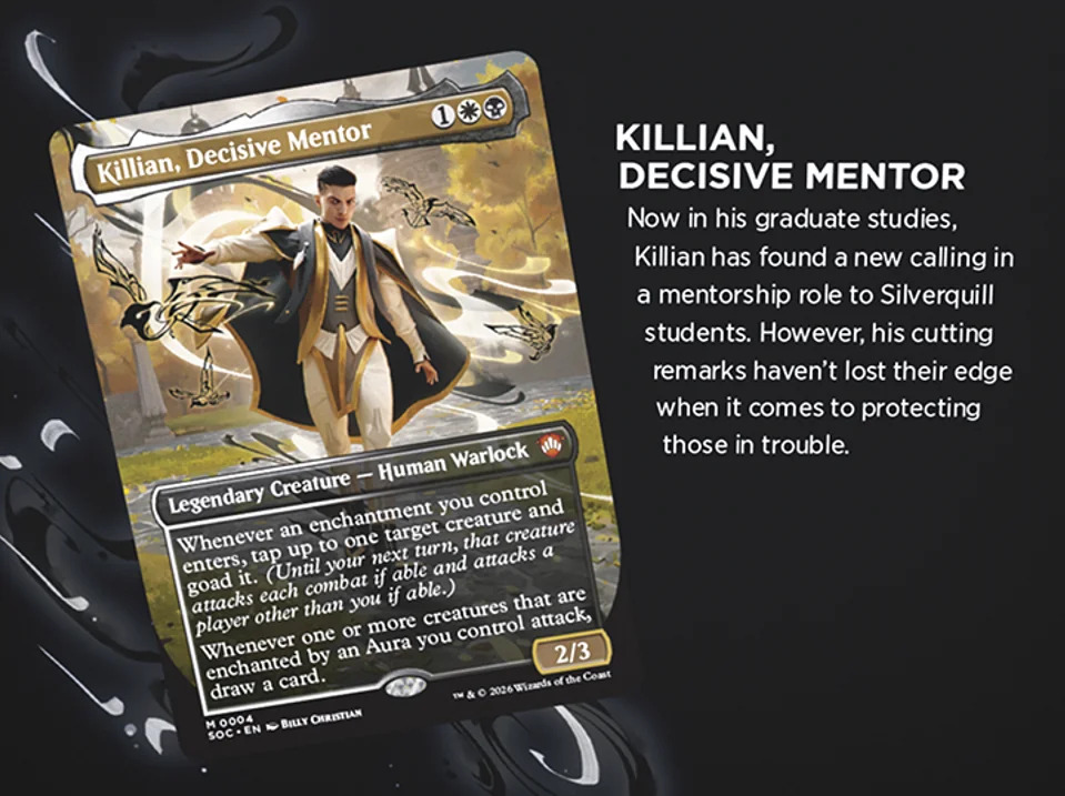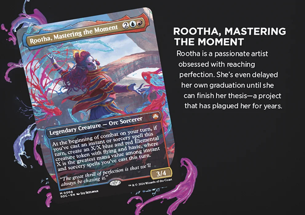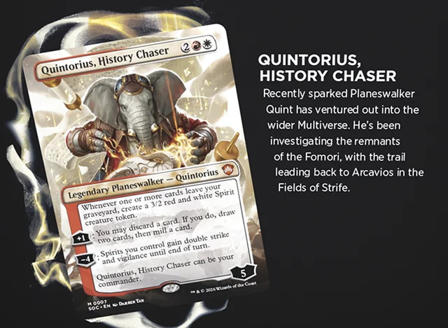 Il protagonista indiscusso di questo ritorno è Quintorius, History Chaser, un nuovo Planeswalker leggendario (mana: 2RW) capace di generare pedine Spirito 3/2 ogni volta che una carta lascia il cimitero. Quintorius guida il mazzo Lorehold Spirit, focalizzato sul buff degli spiriti e sul controllo del cimitero. Accanto a lui, troveremo volti noti come Zimone, Infinite Analyst per il mazzo Quandrix Unlimited e Dina, Essence Brewer per Witherbloom Pestilence, entrambi con abilità potenziate che riflettono la loro crescita accademica.