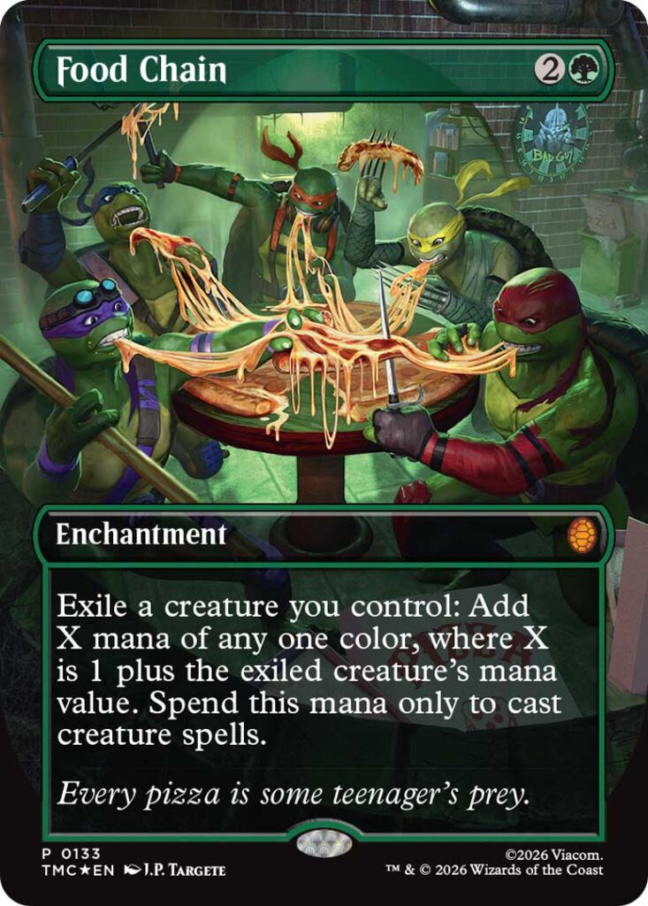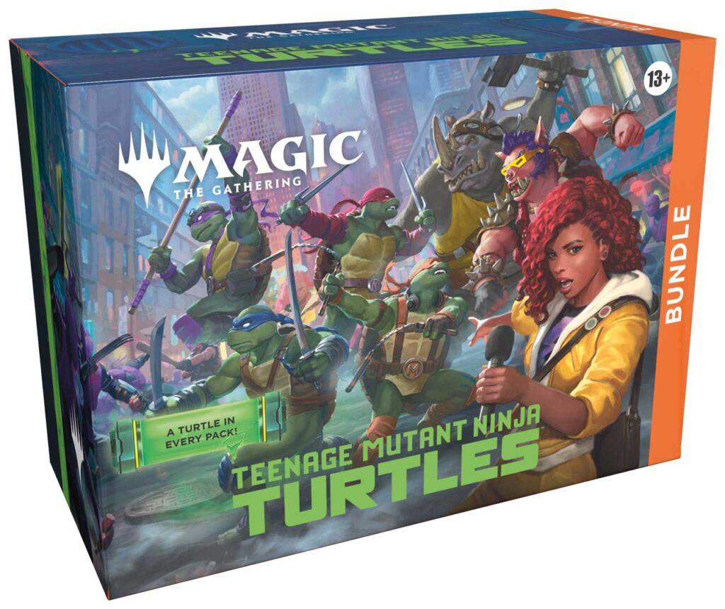 Menzione speciale per il Pizza Bundle. In uscita posticipata rispetto al set principale, questo prodotto si presenta nel classico cartone da asporto e include, oltre alle buste di espansione, un set di terre base e ristampe di carte storiche di Magic rielaborate in chiave tematica, unendo ironia e giocabilità.