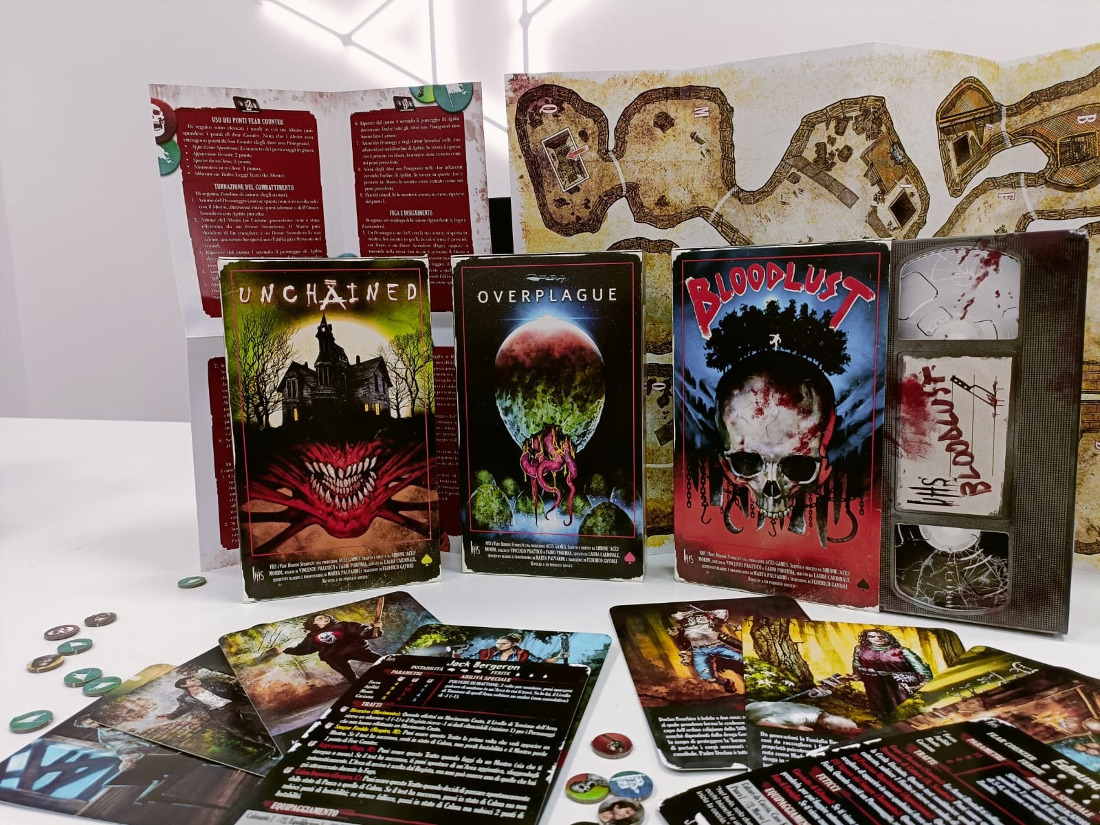 I tre episodi attirano subito l’attenzione, con un colpo d’occhio estetico geniale: i pacchetti sono stati creati e rilegati con la forma dei vecchi e cari VHS (doppio gioco di parole anche col nome, Very Horror Stories), all’interno dei quali troveremo diversi elementi: il manuale con le regole di gioco e le storie, 4 mappe (ovvero i Set dove i registi ambienteranno le 10 storie disponibili, chiamate pellicole), 10 schede dei personaggi pre-creati (con tanto di nome dell’attore, e del personaggio interpretato), un set di token di diverso tipo da utilizzare nel gioco.
