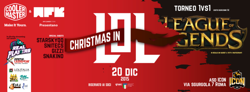 [vc_row][vc_column][vc_column_text]Siamo lieti di annunciare l’organizzazione di Christmas in LoL, evento pre-natalizio presentato e ospitato da ASD ICON in collaborazione con Cooler Master e AFK Store. Christmas in LoL sarà un evento dedicato a tutti i giocatori di League of Legends, con protagonista un Torneo 1vs1 Live, contornato da Interviste, Viewing Zone, Live Commentary delle partite e molto altro! Inoltre saranno presenti degli Ospiti Speciali, come Starsky QQ, Snitecs, Snakino e Gizzi! L’evento sarà presentato da CaptainNeeko.