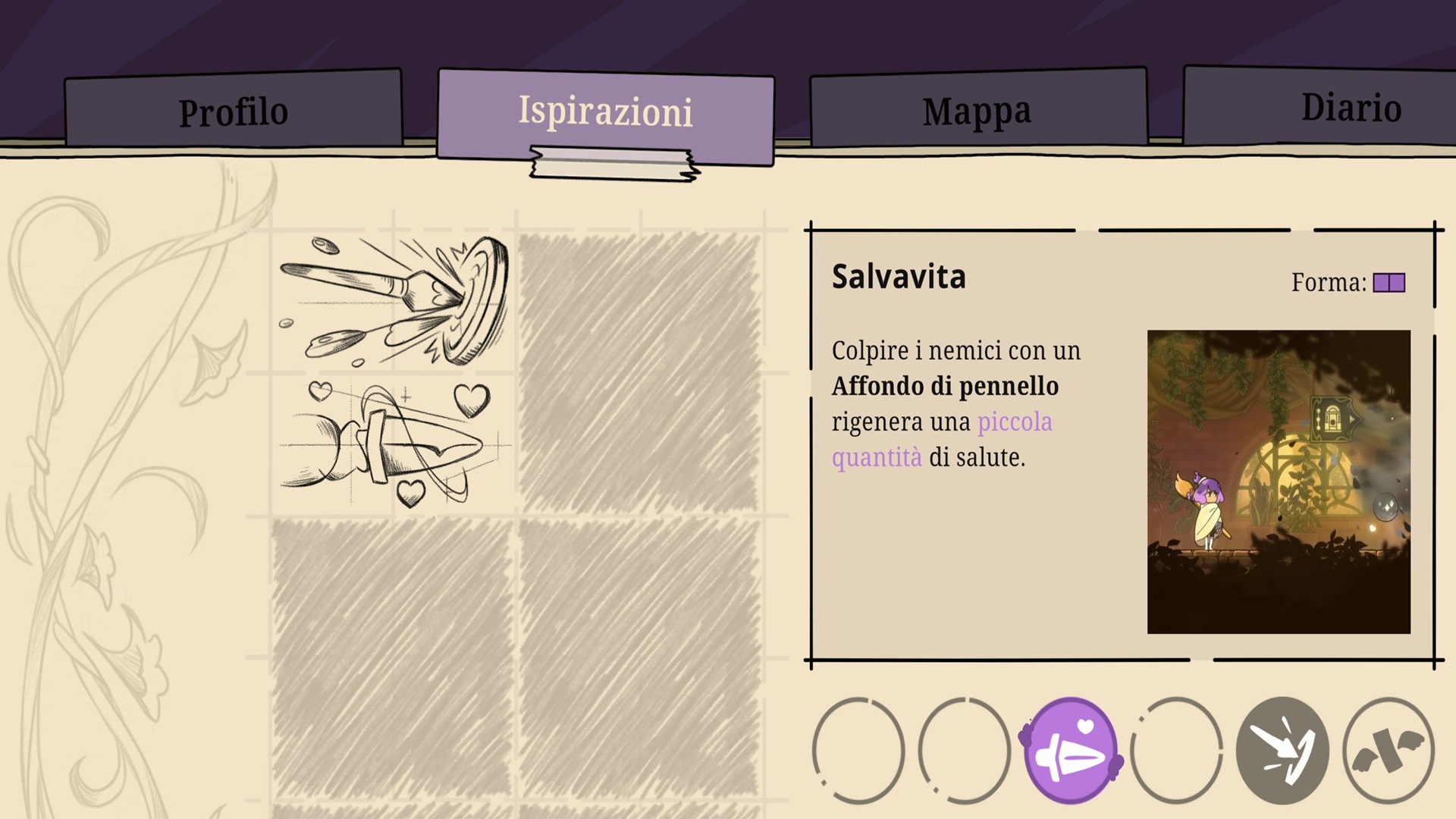 L’affondo di pennello permette a Constance di rimuovere temporaneamente le barriere ambientali e nemiche, oltre ad infliggere un’ingente quantità di danni ed interagire con oggetti ed interruttori nascosti all’interno di pareti e barriere. Spesso è richiesto l’uso continuo e prolungato delle abilità al fine di superare stanze complesse ed enigmi, ciò consuma la barra di pittura della protagonista, la quale, una volta raggiunta la soglia critica, le infligge lo stato di deterioramento.