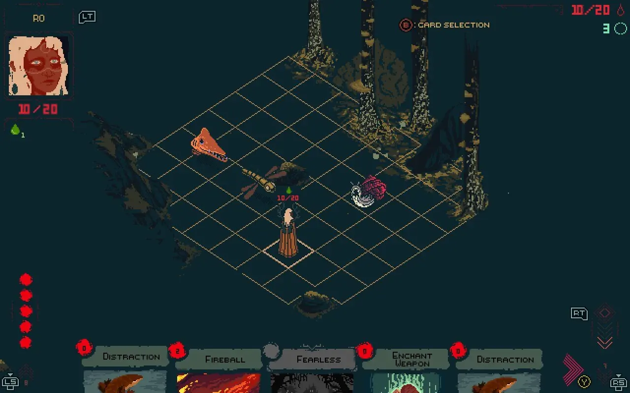 Sul fronte pureamente ludico, Death Howl propone un sistema di combattimento tattico a turni su griglia, basato sull’uso delle carte e, conseguentemente, su una forte componente da deckbuilder; il risultato è un gameplay che ricorda da vicino Into the Breach, soprattutto per l’importanza del posizionamento, della previsione delle mosse nemiche e della gestione dello spazio. Il combattimento viene svolto in piccole mappe cesellate da caselle dove è possibile muoversi e dove generalmente saremo soverchiati dal numero di nemici; nel titolo infatti controlliamo solo la protagonista, mentre i nemici spesso attaccheranno in gruppi di due, tre, anche quattro elementi, rendendo dunque la previsione delle mosse, un po’ come negli scacchi, vitale per la sopravvivenza.