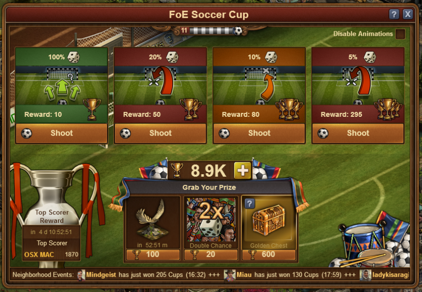 InnoGames annuncia un evento in-game per festeggiare gli Europei di calcio di quest’anno: la Forge of Empires Soccer Cup. Nel corso dell’evento i giocatori calceranno rigori sfidando i vicini con l’obiettivo di ottenere bonus o nuovi ed esclusivi edifici. Durante la Soccer Cup i giocatori avranno nuovi avanzamenti di livello e missioni da risolvere a orari prestabiliti, azioni che verranno poi utilizzate in un mini-gioco condiviso il cui obiettivo consiste nel guadagnare “coppe”. I giocatori potranno scegliere tra quattro diversi tipi di tiri in porta, che varieranno a seconda delle difficoltà e delle probabilità di vittoria. Sulla base della difficoltà scelta i giocatori verranno ricompensati con un diverso numero di “coppe”.