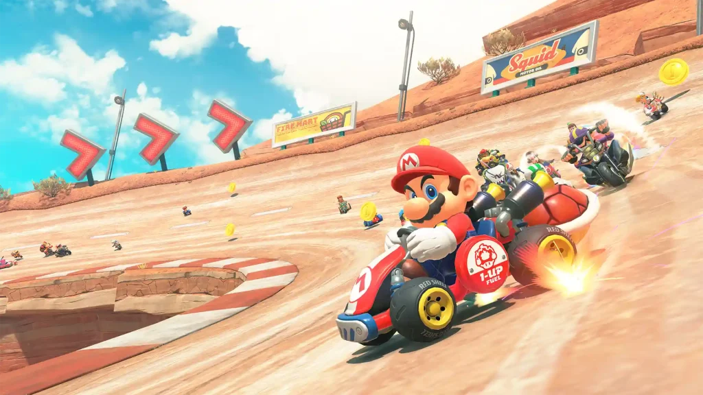 Oltre alle manovre storiche come le derapate con mini-turbo e i salti potenziati nei punti prestabiliti, Mario Kart World introduce nuove azioni che diversificano l’approccio alle gare. Ora è possibile grindare su binari per ottenere accelerazioni extra, eseguire boost jump anche su rettilinei e sfruttare il wall-riding in tratti predisposti, talvolta combinando più tecniche in sequenza per ottimizzare i tempi.