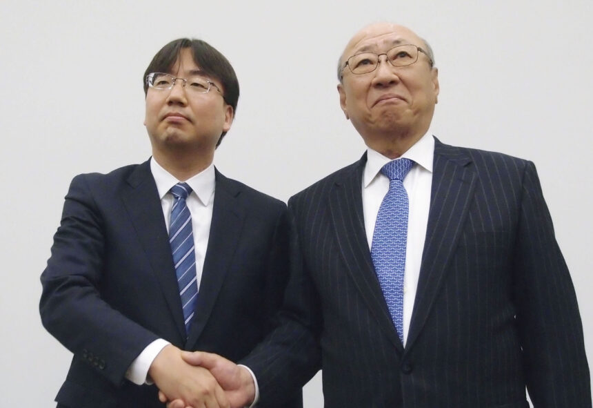Shuntaro Furukawa, left, director at The Pokemon Company, who has also overseen global marketing, shakes hands with Nintendo Co. President Tatsumi Kimishima, during a press conference in Osaka, western Japan, Thursday, April 26, 2018. Nintendo Co. reported Thursday solid sales and profit for the fiscal fourth quarter, powered by brisk demand for its Switch machines, and announced a new president. Furukawa will replace Kimishima, subject to approval at a general shareholders’ meeting in June.(Kyodo News via AP )