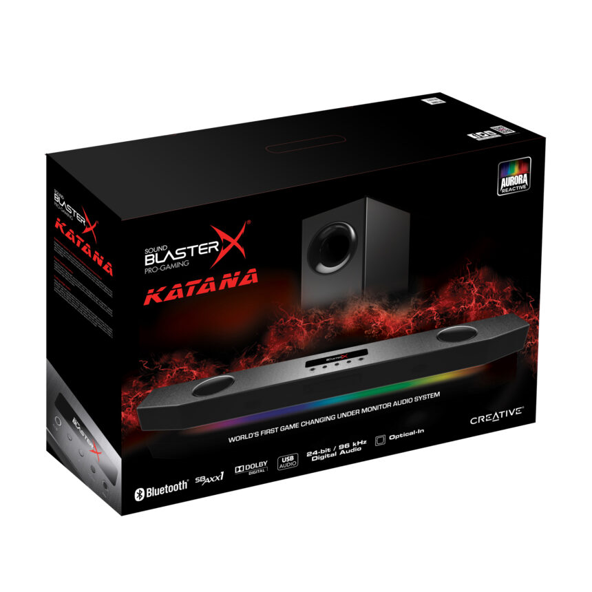 Sound BlasterX Katana viene fornito con il più potente audio multi-core DSP di Creative e che raddoppia la scheda audio di altissima gamma Sound Blaster card/DAC in grado di garantire audio ad alta risoluzione a 24-bit per un suono cristallino, avvolgente, davvero impressionante. Il suo sofisticato design tri-amplificato viene alimentato da 5 driver e si compone di 2 driver mediobassi up-firing, 2 twitter ad alta escursione e un subwoofer long-throw, ciascuno alimentato singolarmente da un amplificatore controllato da DSP per una riproduzione audio precisa e dettagliata all’interno dello spettro audio. Grazie al Sound BlasterX Acoustic Engine e al decoder Dolby Digital 5.1, il suono del nuovo impianto audio è adatto per i giochi e per i film. L’impianto, fatto di alluminio spazzolato, dispone anche di un sistema d’illuminazione reattivo Aurora Reactive programmabile con 16,8 milioni di luci LED.