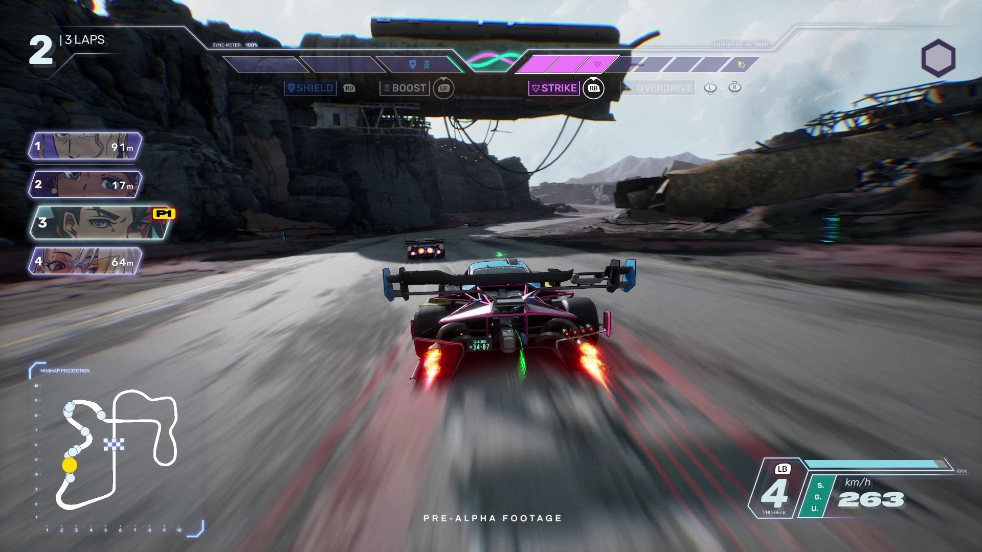 Meccanica chiave di Screamer, il boost ci darà un’enorme spinta in ambito di velocità e, utilizzandolo ripetutamente, andremo a caricare quella che è la barra viola sulla destra, la cosiddetta Entropy. Tale valuta permetterà invece di caricare gli avversari in linea retta: essendo abbastanza vicini, col tasto R1 potremo attivare lo Strike e, letteralmente, puntare i nostri rivali e distruggerli, andando a generare punti e, di conseguenza, andando a caricare di nuovo la barra di Synch sulla sinistra.