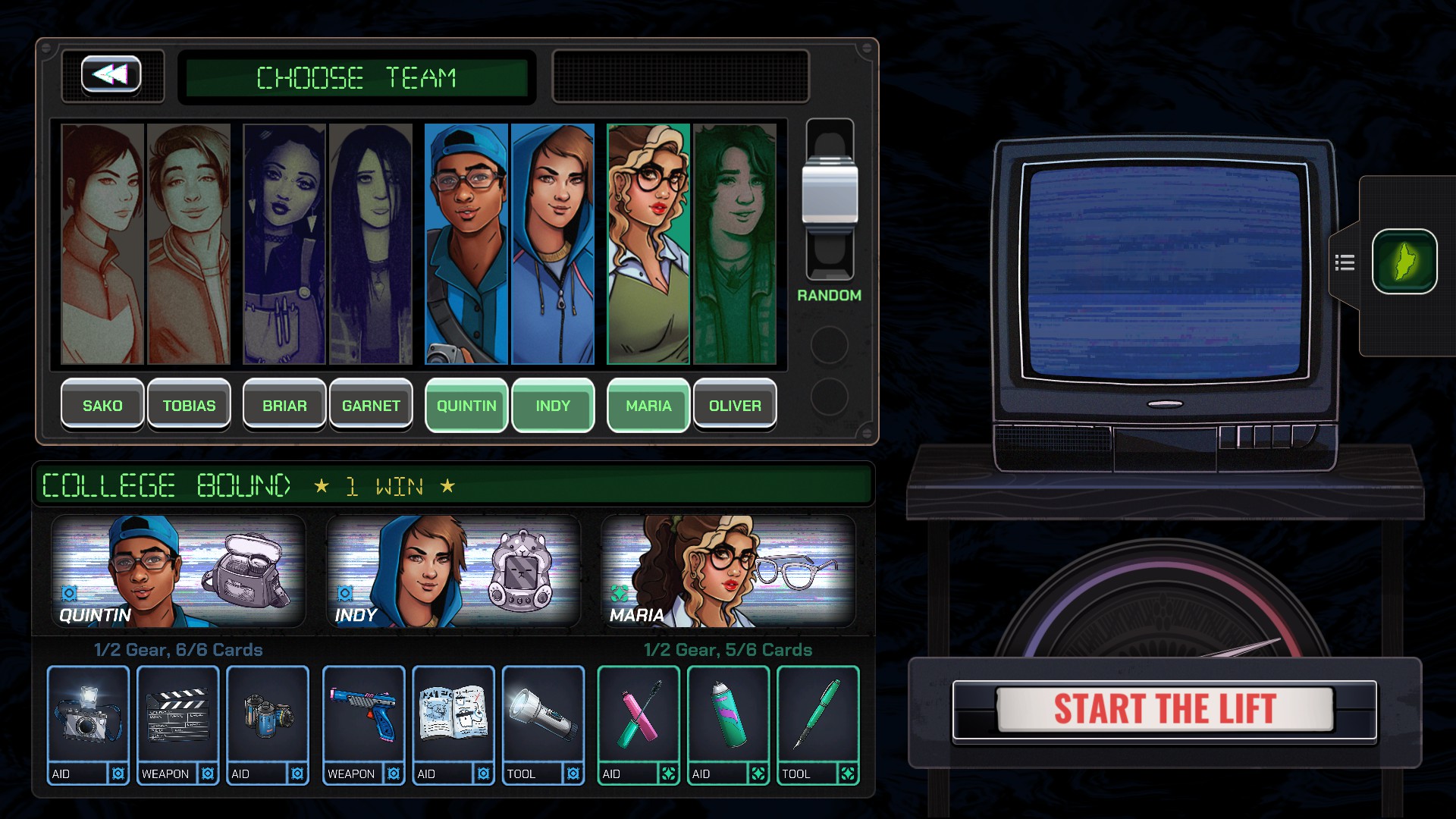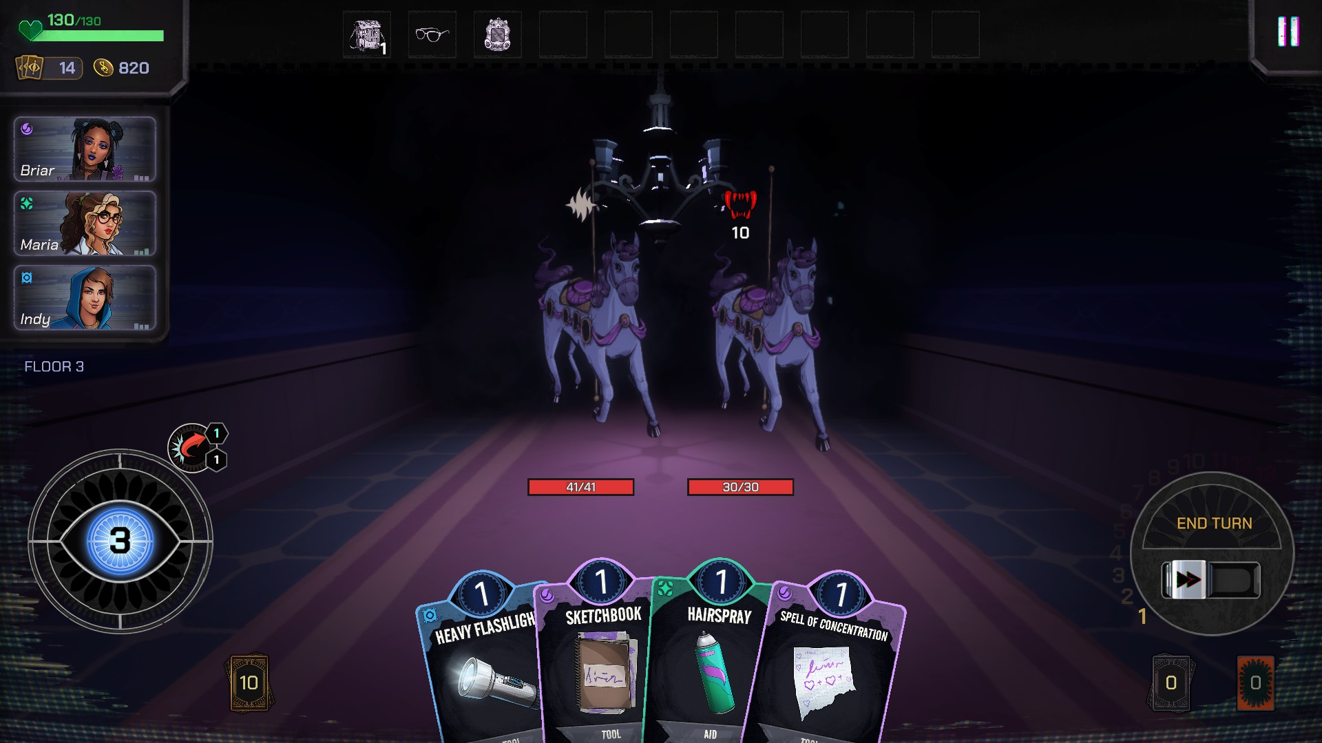Come già detto l’incipit narrativo è molto semplice, anche perché non è altro che il pretesto per collocare i nostri personaggi all’interno di un posto simile. Semplice nella struttura è anche tutto il gioco, che si basa su delle caratteristiche che si ripropongono per forza di cose. Il loop di gioco prevede prima di tutto la scelta dei nostri tre personaggi (quando saranno tutti sbloccati, ce ne sono in totale 8), i quali avranno a disposizione 3 carte di partenza e un gear, che determineranno la vostra strategia iniziale quando partirete nella vostra folle salita. Parliamo di salita, ma non sarà una passeggiata: come tutti i contesti horror che si rispettino, l’ascensore spirituale non può portarvi direttamente all’ultimo piano, ma dovrete procedere uno alla volta.