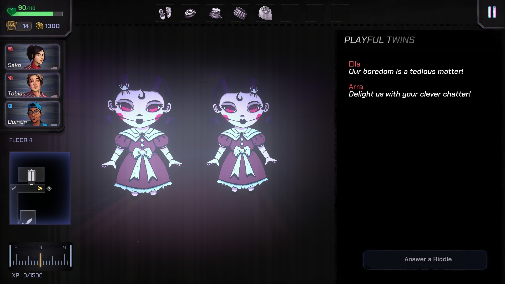 I piani dell’hotel saranno praticamente sempre gli stessi run dopo run, ma parliamo solo della posizione delle stanze: essendo un roguelike, il contenuto delle stanze cambierà sempre, e potrete incontrare combattimenti, stanze vuote dove scovare monete o carte, ma anche eventi. Questi ultimi ci metteranno sempre di fronte a delle scelte difficili, che in percentuale potranno darci monete, indizi sulla storia dell’hotel (che ritroveremo tutti nel database, e ci faranno conoscere la storia sbloccando anche qualcos’altro…), o anche esperienza, dato che salendo di livello potremo potenziare le carte che abbiamo nel mazzo. Rischiereste una carta per salvarvi la pelle? Vi siederete a prendere il thè con delle bambole assassine? O berreste da una fiala di laboratorio senza conoscere le conseguenze? Questi sono solo piccoli esempi degli eventi, ma ce ne sono dei più disparati, e vi possiamo assicurare che il guadagno che ne trarrete, dopo il rischio, vale praticamente sempre la candela.